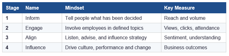 The model identifies four distinct stages of internal communications maturity. Most organisations pass through them in order, though the speed of progression varies considerably. Some organisations skip stages under pressure; others regress when leadership changes or investment is withdrawn.